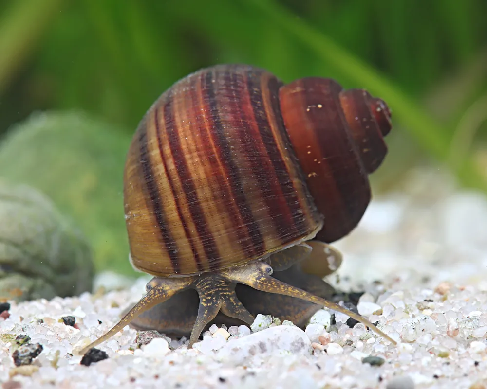 Zebra Nerite Snails are excellent at consuming algae and organics. However in large numbers they will require extra food. For this reason it is wise to stock no more than one snail for every 5 gallons of aquarium water. Zebra Nerite Snails for at least a year growing to a maximum size of 1".