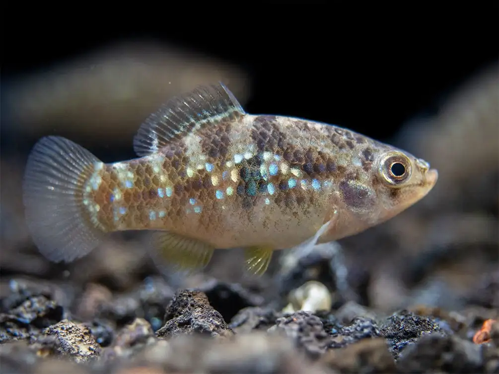 Jordanella floridae is a 2- to 2.5-inch (5–6 cm) North American pupfish, or type of killifish. It is not an annual killifish, meaning that it lives longer than one year and does not need to be immediately bred to maintain the population. Its common name comes from the male’s unique coloration — rows of red and blue horizontal striping with a yellow shoulder patch — that looks like the stars and stripes of the United States flag. The female, on the other hand, is smaller, less colorful, and has a rounder abdomen when carrying eggs. Both sexes display a prominent black spot on the sides of their bodies, but females often have another small black dot on the back edge of the dorsal fin. Personality-wise, they are very active and constantly dart around looking for algae and other leftover crumbs to eat. Their mouths are perfectly shaped for ripping off hair algae, black beard algae, and other fuzzy types of algae.