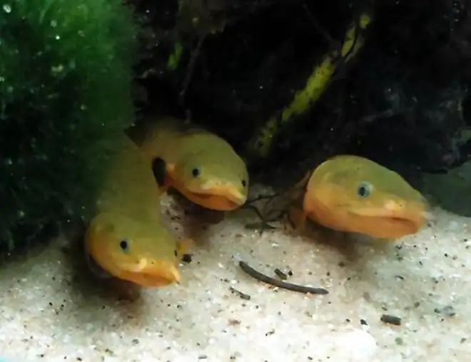 Both fish will remain motionless whilst a few eggs are deposited in a cup formed by the male"™s anal fin, and there they will be fertilised before being dispersed by powerful movements of his tail. The eggs, 2.1-2.6mm in diameter, are adhesive and will stick to the plants. This procedure is repeated many times until the female is spent of eggs. The adults exhibit no parental care. Larvae hatch after approximately 70 hours, but remain attached to the vegetation whilst they absorb their yolk sacs. Some 2.5-3 weeks later they will begin feeding. At this stage they have external gills with many branches and resemble salamander larvae (these external gills are lost as the fish grows). In the wild, these fish are known to spawn throughout the year, but with a peak of heightened activity once during the year.