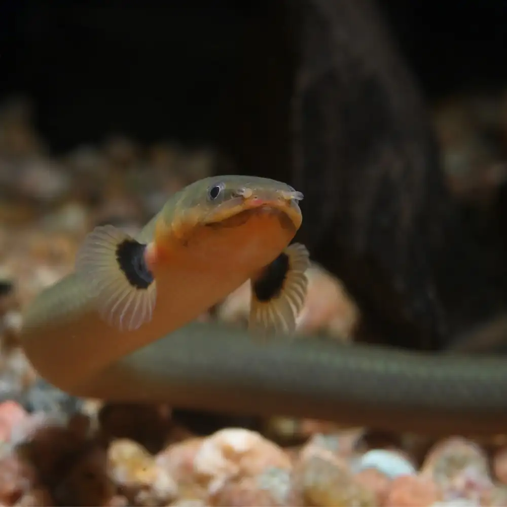 The Reed Fish is a snake-like species that is consistently popular with many oddball enthusiasts. These elongated fish are known from slow flowing rivers and even standing waters with relatively low oxygen content, where they live amongst labyrinthine reedy habitats. In addition to moving snake-wise over the substrate, they can also side-wind through the water column at a fairly rapid pace. As a nocturnal species, Reed Fish are most active during the night when they will spend time searching for and feeding on crustaceans, insects, and worms. An aquarium that houses this species should be spacious - ideally at least 5ft x 2ft x 2ft for adult specimens - and very well covered, as these fish are great escape artists. Ensure that any gaps where wires feed in to the aquarium are plugged securely with filter foam or mesh glued into place. The lid of the aquarium may also need to be weighted down. Reed Fish have the ability to breathe atmospheric air via their modified swim bladders (part of which functions as an accessory breathing organ to allow them to survive out of water for a time), so a small gap MUST be left between the surface of the water and the cover slides in order for the fish to come up to the surface and take air in. If the fish are denied regular access to air above the surface of the water, they may actually drown, so always run the tank with a dropped waterline.