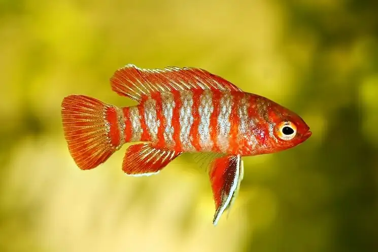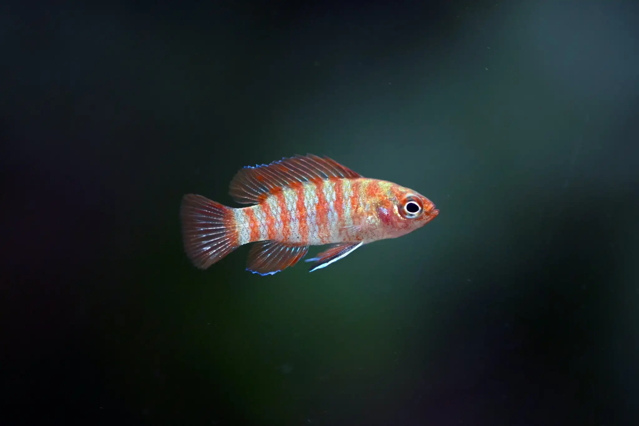 Males feature 7 dark vertical bars across sides with bold red coloration, while females exhibit uniform grayish coloration or indistinct vertical bars. Breathtaking coloration and activity peaks during spawning, with rival males "facing off" or "dancing" alone for a female's attention.