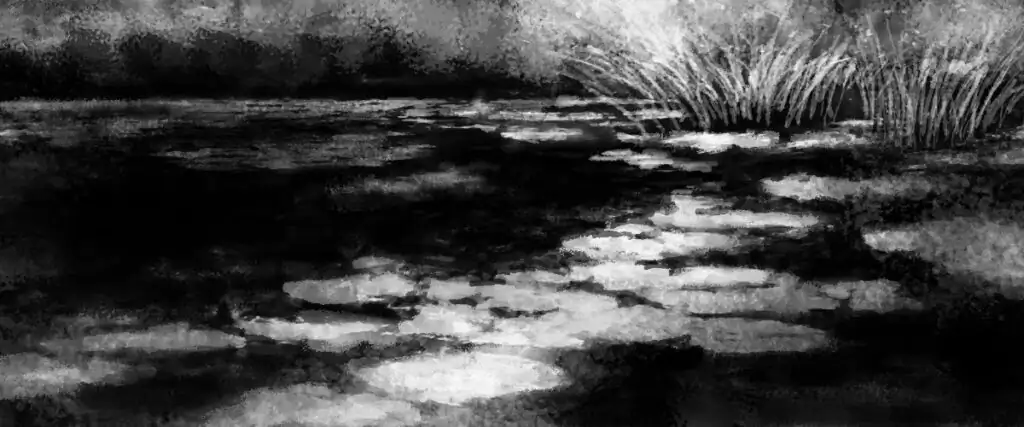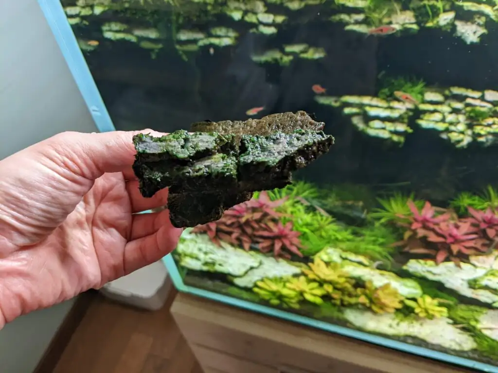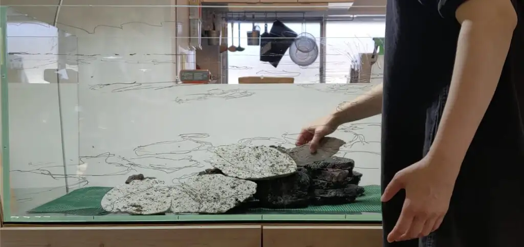 I decided to slice pumice stones to create a waterside landscape with floating lotus leaves .