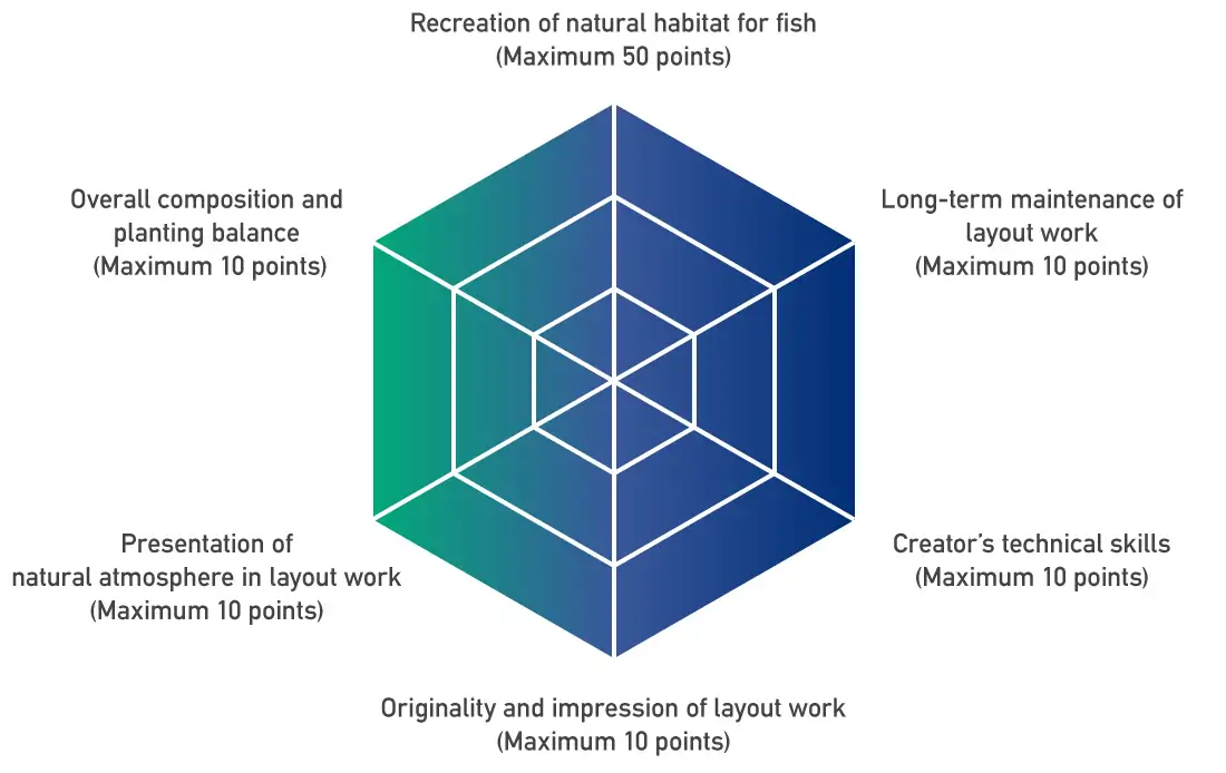 For the parameters in the judging criteria, a focus is placed on “Recreation of natural habitat for fish” which is deeply associated with the origin of planted aquarium. These judging criteria do not limit the scope of layout expression of contestants. Their objective is to clearly define an essential feature of planted aquarium; recreating a comfortable environment to fish in a tank.
