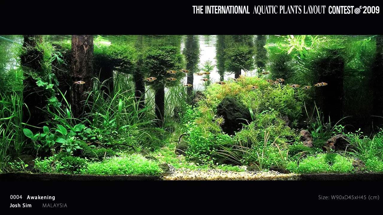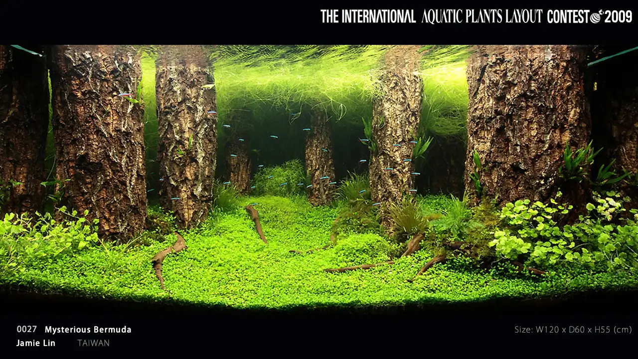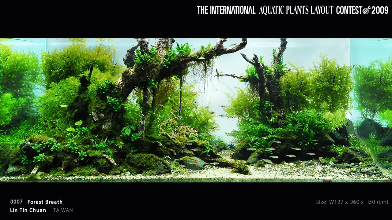 2009 - IAPLC #7 by Lin Tin Chuan (Taiwan). Mr Lin is the first scaper that use vertical hanging roots in aquascaping contest. What is special about this layout was that he used a combination of real roots from the ferns and some small straight woods to create this stunning effect. A technique that remain popular until today