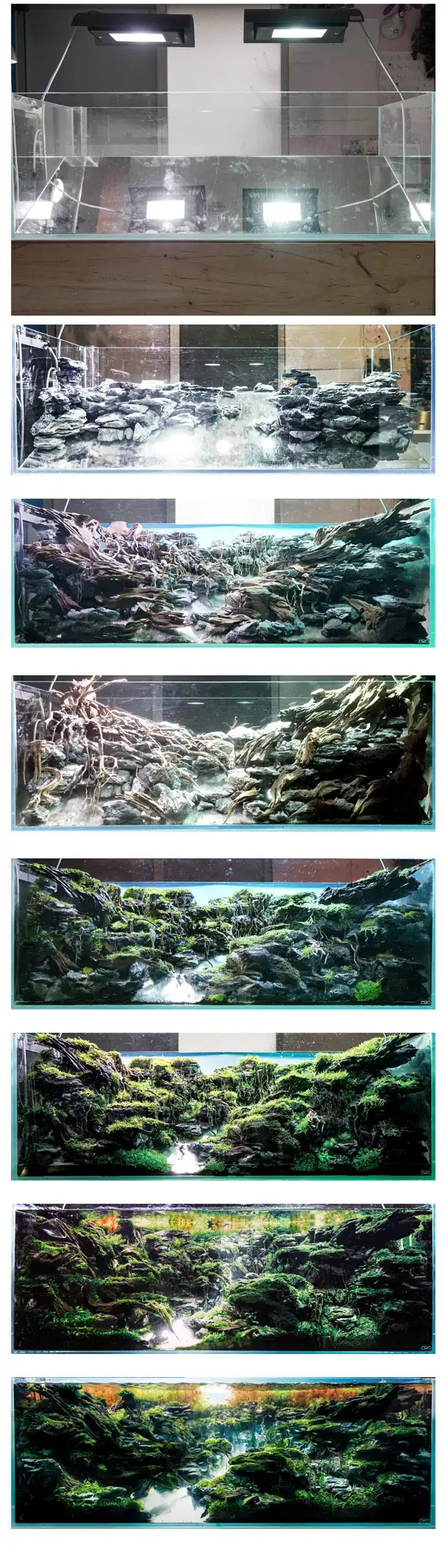 The overall scenery in this layout is perfectly balanced. There's a great impression of deepness, with the planted ridge on the background that seems far away. The contestant had also the good idea to put some massive elements close to the foreground, which strongly counterbalance with the background cliffs. So we have different levels to watch, going on details one after the other. Then there's this hole in the middle. Instead of planting or positioning rocks or roots, in a more traditional way, the aquascaper installed a huge crack from where the bright light is coming. This is quite original and, fortunately, gives more shape to the cliffs around. The layout has a very particular contrast with shade and light. A bigger crack could have ruined the whole layout; a smaller one would seem ridiculous. By doing so, the artist shows how he controls his entire layout. Nothing is left to chance. The use of rocks and roots is well balanced and inspired by true natural sceneries. The driftwoods emerge from the stones, just like some dead trees remaining on mountain ridges. The artist used several techniques, combining skilfully the hardscape with some planted areas. On the foreground, mosses and some isolated plants are the main attraction. On the background, stem plants are everywhere on the ridge. And the colour combination, alternating green and red colours, is just perfect. The contestant uses moderately the coloured plants like a painter with some subtle touches of colour. He perfectly knows how to display the elements without doing too much. The fish are in good health despite this generous lighting. It's a beautiful and original scenery, achieving to recreate a layout combining natural elements with a moderate dose of weird lightning, for the pleasure of the eyes and the organisms living in. Congratulations!